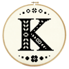 This listing contains the original cross-stitch pattern for the "Mini Folk Letter K" design. The letter is designed to fit neatly into a 5" wooden hoop when stitched onto 27/28-count linen or 14-count aida, and takes just a few hours to stitch, so is perfect for beginners or last-minute gifting.