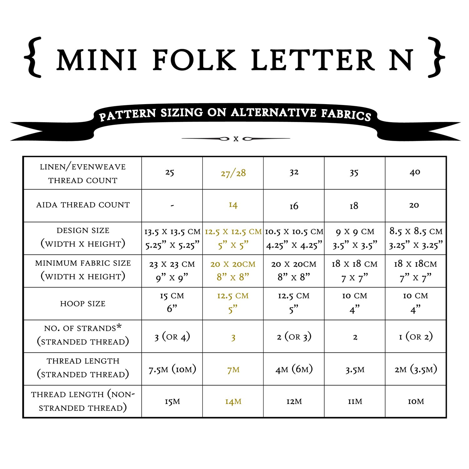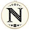 This listing contains the original cross-stitch pattern for the "Mini Folk Letter N" design. The letter is designed to fit neatly into a 5" wooden hoop when stitched onto 27/28-count linen or 14-count aida, and takes just a few hours to stitch, so is perfect for beginners or last-minute gifting.